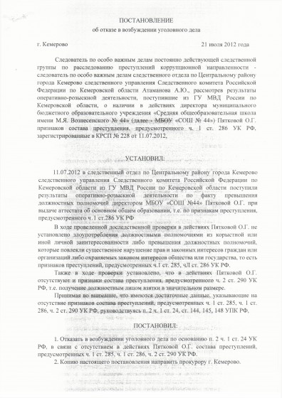 «В июле 2012 года в ходе проведения доследственной проверки, принято решение об отказе в возбуждении уголовного дела в отношении директора школы Пятковой О.Г. т.к. не установлено злоупотребления должностными полномочиями из корыстной или иной личной заинтересованности, либо превышение должностных полномочий, которые повлекли существенное нарушение прав и законных интересов граждан или организаций, либо охраняемых законом интересов общества или государства, т.е. признаков состава преступлений, предусмотренных ч. 1 ст. 285, ч. 1 ст. 286, и ч.2 ст. 290 УК РФ, что подтверждено постановлением об отказе в возбуждении уголовного дела от 21.07.12г.», — сказано в постановлении об отказе в возбуждении уголовного дела.