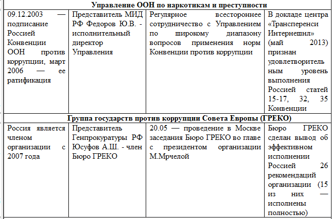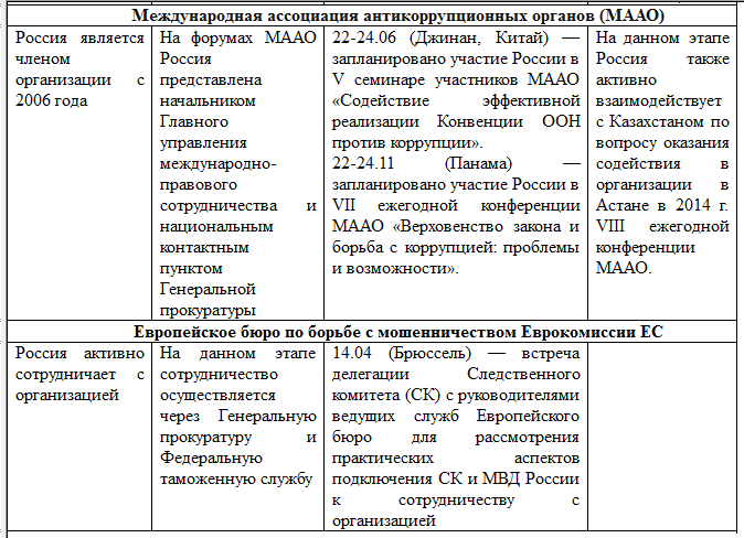 Представляемые ниже табличные данные наглядно подтверждают тенденцию к укреплению международной составляющей деятельности России по борьбе с коррупционными проявлениями и свидетельствуют о серьезности намерений российских властей динамично развивать соответствующие партнерские связи.