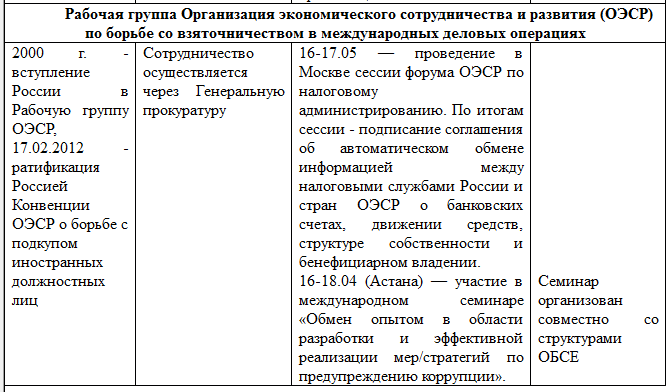 Кроме того, 13 февраля 2012 г. вступил в силу Федеральный закон от 01.02.2012 № 3-ФЗ, в соответствии с которым Россия присоединилась к Конвенции ОЭСР по борьбе с подкупом иностранных должностных лиц при осуществлении международных коммерческих сделок. В настоящее время российскими властями проводится значительная работа по выполнению указанной Конвенции.